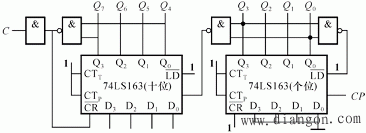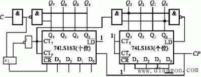 异步式的100进制计数器:74LS163是同步清零、置数,上升沿触发。