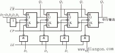 ⑴ 串行输入/输出(SISO):一位数据一个CP脉冲地依次存入,如存入D3D2D1D0=1011信息。