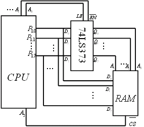 这是一个CPU和RAM之间进行信息读取的硬件电路,CPU的地址低二位A1、A0控制373进行数据存入或读出,373作RAM的地址锁存用。数据读取具体操作如下: