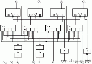 在控制信号的控制下,信息可以依次从右向左或从左向右存入并实现移位操作。双向移位寄存器CC40194型的逻辑电路图: