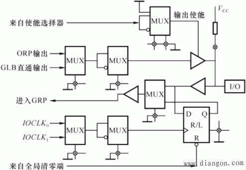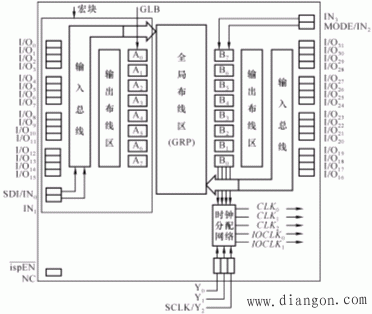 其内部有:1个全局布线区GRP(Global Routing Pool),1个时钟分配网络二个宏块(Magablock),宏块内部又有8个通用块GLB(Generic Logic Block),1个输出布线区ORP(Output Routing Pool),1个输入总线16个I/O口,2条输入引脚;