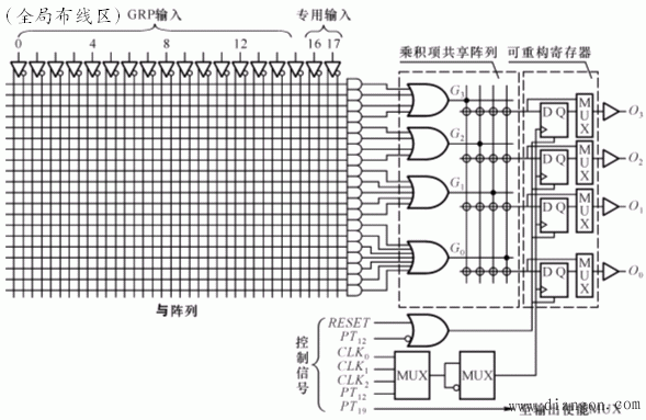内有:与阵列、乘积项共享阵列、可重构寄存器以及控制电路等四部分。