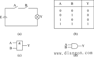 只有决定一件事情的条件全部具备之后,这件事情才会发生,否则不发生。这种逻辑关系称为逻辑与的关系。逻辑与的运算符号是“・”,也可以省略。在图1(a)所示电路中,开关A、B与灯Y串联连接,如果开关的闭合状态用“1”表示,断开状态用“0”表示,灯亮的状态用“1”表示,灯灭的状态用“0”表示,则开关与灯之间的逻辑关系可以用图1(b)表示,称为逻辑真值表。