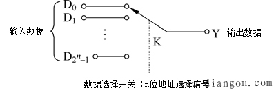 除了前面讲过的编码器、译码器,还有一种经常使用的集成组合逻辑电路器件,就是数据选择器。数据选择器的功能是根据地址选择码从多路输入数据中选择一路送到输出。其作用可用图1所示的单刀多掷开关表示。D0~D2n-1为输入数据,Y为选择输出的数据,S是选择开关,实际上是n位地址信号,最大可以控制选择的数据为2n个。
