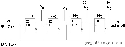 由图1可知,由第一个D触发器FF0的输入端接收输入信号,其余的每个触发器的输入端均与前一个触发器的输出端相连。各触发器的时钟脉冲控制端与同一个时钟脉冲CP信号相连,因此各触发器的触发时刻相同,都是CP脉冲的上升沿。