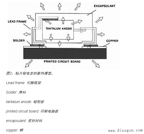 在我们考虑纹波前,我们必须注意由施加的直流偏压产生的发热。电容不是理想器件,一种寄生现象是跨接介电材料的并联电阻,该电阻将导致漏电流(DCL)的发生。这个小DC电流会导致发热,但是不像其它典型应用的纹波状态,该发热通常可忽略不计。一个100uF/10V贴片式钽电容,在室温下,其DCL不超过10uA(100uA@85℃),所以其最大功耗为1mW。