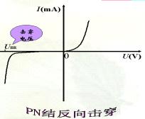 | 反向击穿电压:发生击穿所需的反向电压UBR. PN结的反向击穿:当加到PN结上的反向电压增大到某个数值时,反向电流急剧增加。 特点:随着反向电流急剧增加,PN结的反向电压值增加很少。 | ||||||||||||||||||||