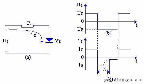 当输入电压UI 由正值U F 跃变为负值U R 的瞬间,VD 并不能立刻截止,而是在外加反向电压 UR作用下,产生了很大的反向电流IR ,这时 iD=I R≈- U R/R,经一段时间 t rr后,二极管 VD 才进人截止状态,如图2.(c) 所示。通常将t r r 称作反向恢复时间。