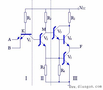 ①输入有低电平0.3V时,K点电位为1V,V 1导通,V2、 V5截止,V3 、V4导通。(F为3.6V高电平。)