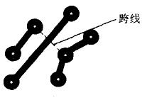 3)单面印制电路板的某些印制导线有时要绕着走或平行走,这样印制导线就比较长, 不仅使引线电感增大,而且印制导线之间的寄生耦合也增大,这对于低频电路影响不明显,但对高频电路影响显着,因此必须保证高频导线、晶体管各电极的引线、输入和输出线短而直,并避免相互平行。若个别印制导线不能绕着走,此时为避免导线交叉,可用跨线,如图2-14所示。对于高频电路应避免用外接导线跨接,若交叉导线较多,最好用双面印 制电路板,将导线印制在板的两面,这样可使导线短而直。用双面板时,两面印制导线应避免互相平行,以减少导线之间的寄生耦合。