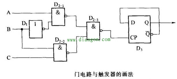 数字集成电路在电路图中一般采用分散画法,直接用逻辑图形符号表示。门电路,触发器等都采用这种画法,如下图所示。
