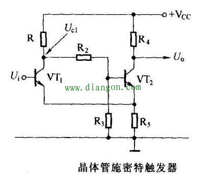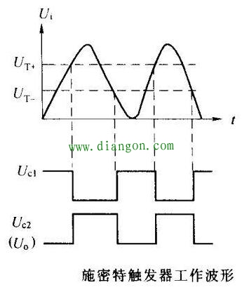 当输入信号经过峰值后下降时,电路并不翻转,只有当继续下降至反向阈值电压时,电路才再次发生反转回到第一稳定状态,即VT1截止,VT2导通的状态。这是因为VT1的集电极回路接有R2,R3分流支路,使得VT1导通时的发射极电流小于VT2导通时的发射极电流的缘故。下图所示为施密特触发器波形图。