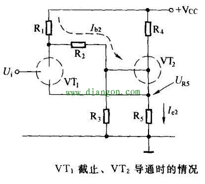 没有输入信号时,晶体管VT1因无基极偏置电流而截至。电源+VCC经R1,R2微晶体管VT2提供基极偏置电流,VT2导通,其发射极电流在发射极电阻R5上产生压降,正是这个电压使得VT1的发射结处于反相偏置状态,进一步保证了电路处于稳定的VT1截止,VT2导通的状态。如下图所示。