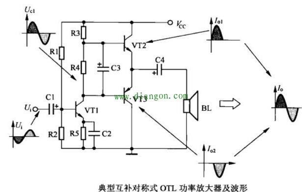 典型电路如下图所示。互补对称式OTL功率放大器的功率放大管由一只NPN型三极管VT2和一只PNP型三极管VT3构成,所以只需要一个基极信号就可以工作,而这个信号就是激励管VT1的集电极输出的电压信号。