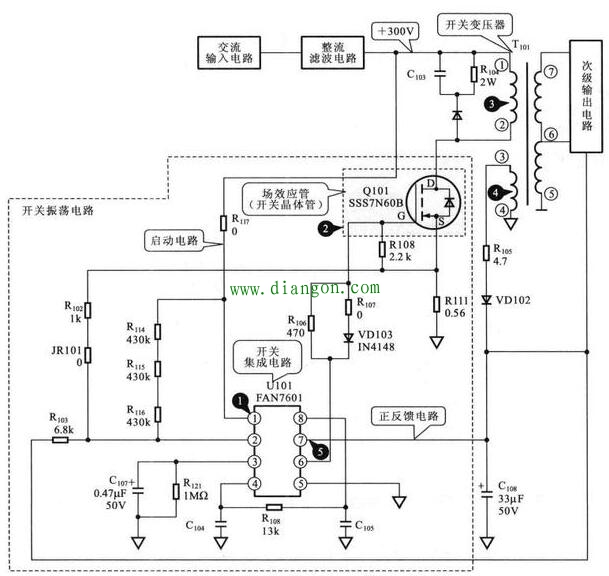 开关集成电路U101中的振荡器起振,为场效应管Q101的栅极G提供振荡信号,于是场效应管Q101开始振荡,使开关变压器T101的初级线圈中产生开关电流,开关变压器的次级线圈3、4中便产生感应电流,3脚的输出经整流、滤波后形成正反馈电压加到U101的7脚,从而维持振荡电路工作,使开关电源进入正常的工作状态。场效应管作为该电路中的脉冲放大器件,用于实现“开关振荡”的功能。