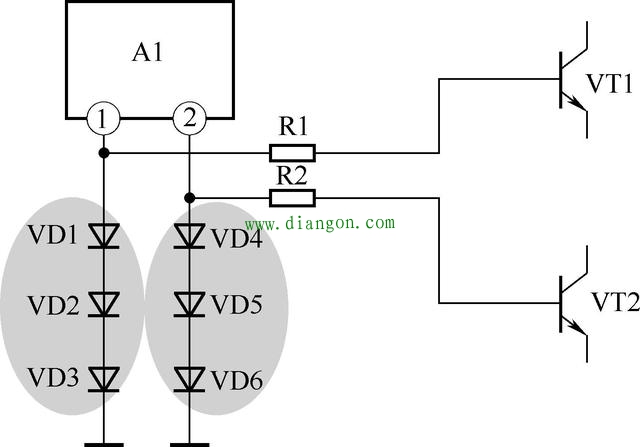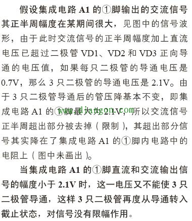 图1 所示是二极管限幅电路。在电路中,A1 是集成电路(一种常用元器件),VT1和VT2 是三极管(一种常用元器件),R1 和R2 是电阻器,VD1 ~VD6 是二极管。