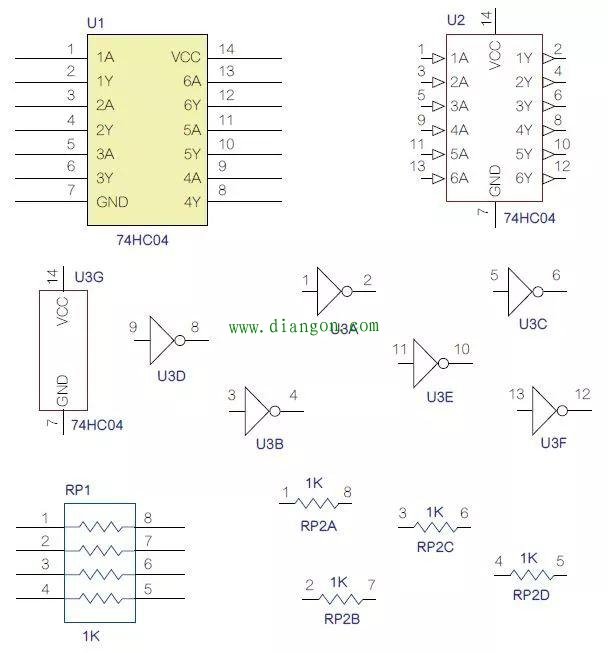 图1中的六反相器U1不是很实用。它将6个反相器合成在一个符号中,并且左边和右边都有输入输出。引脚长度也不需要那么长。U2这个符号稍微好一些,输入都在左边,输出都在右边。像我这样一把年纪的人不喜欢彩色背景,因为经过六次黑白拷贝黄色会变成黑色,从而让你无法看清任何东西。我创建的U3由不同元件组成(异构元件),包括6个相同的元件和表示电源与地的第7个元件。排阻RP1是非常愚蠢的画法,当这些电阻应该处于原理图上不同位置时很容易把原理图弄得一团糟。RP2显示了异构元件在这种时候的作用。