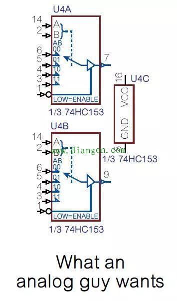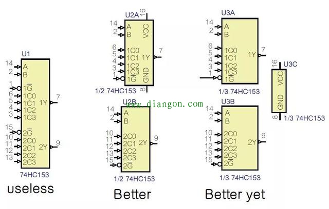图2:许多工程师都不喜欢ANSI/IEEE逻辑符号画法,这些符号简直是非徒无益,而又害之。显示实际的逻辑符号稍好一些。CAD软件包中附带的元件基本上是没有用的。较好的做法是将元件一分为二。更好的做法是将电源独立出来,这样就不会弄乱信号流向。模拟工程师最想要的是在元件内部稍微画一些能表示其功能的图案。