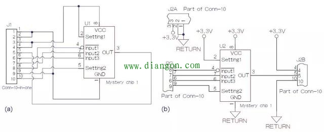 图6:如果你将连接器只画成一个元件符号,会使得原理图很乱(a)。通过使用OrCAD中的异构元件功能,或Altium/CircuitStudio中的元件“模式”,你可以将连接器分解开来,以便原理图的流向更清晰更容易理解(b)。