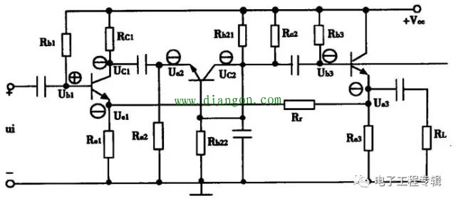 Ue3为ß ,经电阻Rf和e1返送到T1管的发射极,则Ue1为ß,即反馈信号的瞬时极性为ß。