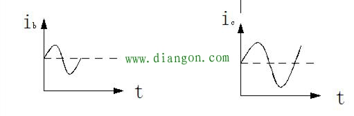输入电压u1、u2是激励,基极电流ib是响应,基极电流ib、集电极ic的波形如下,ib与u1波形一致,也为脉动直流,三极管工作在放大区,符合ic=βib的关系,信号电流被放大,集电极电流ic波形与输入电流ib波形一致;也就是ib和ic是同相关系,要增加都增加,要减小都减小;见下图输入电流与输出电流波形图。