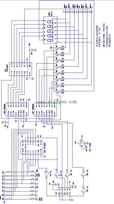 图1 中达VFD-B型变频器操作显示面板电路中达VFD-B型变频器操作显示面板电路,为六线式被动型显示面板电路:BJ1通讯端子共有六线,即+5V、GND供电二线、三线主板MCU输入串行数据信号、一线返回按键信息。处理主板MCU来的三线信号和处理键信息,均由8位移位寄存器芯片来完成。由于芯片是用来专门处理显示数据和按键数据的,我在这里姑且称之为专用数据处理器。