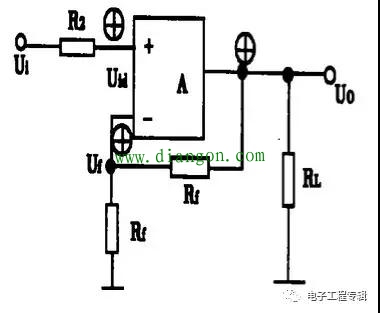 例如,图2所示电路,按瞬时极性法判断。设同相输入端u+有一瞬时增量©,则输出uo为©,经电阻Rf返送至反相输入端,使u-为©,即反馈信号的瞬时极性为©。