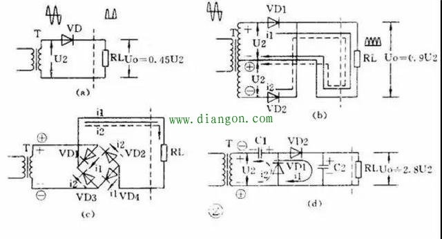 用 4 个二极管组成的桥式整流电路可以使用只有单个次级线圈的变压器,见图 2 ( c )。负载上的电流波形和输出电压值与全波整流电路相同。
