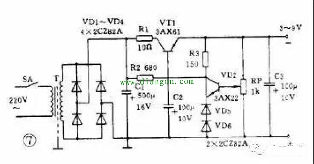 图 7 是一个实用的稳压电源。输出电压 3 ~ 9 伏可调,输出电流最大 100 毫安。