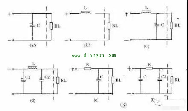 电感器的成本高、体积大,所以在电流不太大的电子电路中常用电阻器取代电感器而组成 RC 滤波电路。同样,它也有 L 型,见图 3 ( e );π 型,见图 3 ( f )。