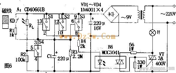 电路如图6所示。A是四组模拟电子开关(S1~S4):S1,S2,S3并联(可增加驱动功率及抗干扰能力)用于延时电路,当其接通电源后经R4,B6驱动双向可控硅VT,VT直接控制门厅照明灯H;S4与外接光敏电阻Rl等构成环境光线检测电路。当门关闭时,安装在门框上的常闭型干簧管KD受到门上磁铁作用,其触点断开,S1,S2,S3处于数据开状态。晚间主人回家打开门,磁铁远离KD,KD触点闭合。此时9V电源整流后经R1向C1充电,C1两端电压很快上升到9V,整流电压经S1,S2,S3和R4使B6内发光管发光从而触发双向可控硅导通,VT亦导通,H点亮,实现自动照明控制作用。房门关闭后,磁铁控制KD,触点断开,9V电源停止对C1充电,电路进入延时状态。C1开始对R3放电,经一段时间延迟后,C1两端电压逐渐下降到S1,S2,S3的开启电压(1.5v)以下,S1,S2,S3恢复断开状态,导致B6截止,VT亦截止,H熄来,实现延时关灯功能。