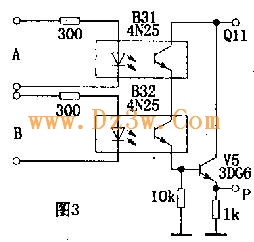 图3电路为“与门”逻辑电路。其逻辑表达式为P=A.B.图中两只光敏管串联,只有当输入逻辑电平A=1、B=1时,输出P=1.同理,还可以组成“或门”、“与非门”、“或非门”等逻辑电路.
