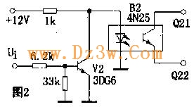 图1电路中,当输入信号ui为低电平时,晶体管V1处于截止状态,光电耦合器B1中发光二极管的电流近似为零,输出端Q11、Q12间的电阻很大,相当于开关“断开”;当ui为高电平时,v1导通,B1中发光二极管发光,Q11、Q12间的电阻变小,相当于开关“接通”.该电路因Ui为低电平时,开关不通,故为高电平导通状态.同理,图2电路中,因无信号(Ui为低电平)时,开关导通,故为低电平导通状态.