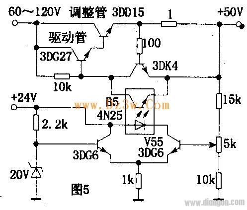 电路如图5所示.驱动管需采用耐压较高的晶体管(图中驱动管为3DG27)。当输出电压增大时,V55