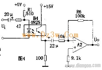 电路如图4所示.这是一个典型的交流耦合放大电路.适当选取发光回路限流电阻Rl,使B4的电流传输比为一常数,即可保证该电路的线性放大作用。