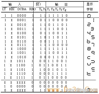 此时BI/RBO端作为输出端, 端输入低电平信号时,表1最后一行,与 及DCBA输入无关,输出全为“1”,显示器7个字段都点亮。该功能用于7段显示器测试,判别是否有损坏的字段。
