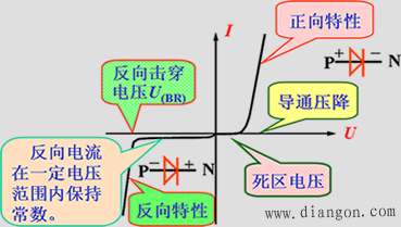 正向特性:当外加正向电压较小时,正向电流很小,二极管呈现出较大的电阻(图中OA段和OA’段);正向电压超过某一数值(UD称为其实电压或死区电压,硅管为0.6到0.8伏,锗管委0.2伏),电流随着电压增加得很快(图中的AB段和A’B'段)。但增加的电流不能超过二极管允许电流,否则二极管会被烧坏。