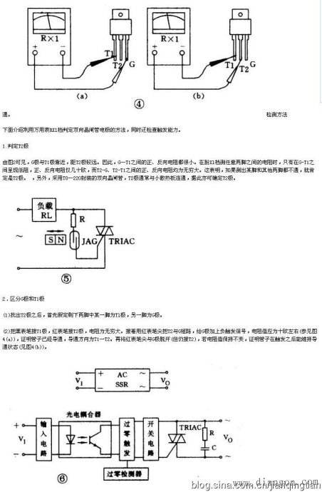 先任测两个极,若正、反测指针均不动(R×1挡),可能是A、K或G、A极(对单向可控硅)也可能是T2、T1或T2、G极(对双向可控硅)。若其中有一次测量指示为几十至几百欧,则必为单向可控硅。且红笔所接为K极,黑笔接的为G极,剩下即为A极。若正、反向测批示均为几十至几百欧,则必为双向可控硅。再将旋钮拨至R×1或R×10挡复测,其中必有一次阻值稍大,则稍大的一次红笔接的为G极,黑笔所接为T1极,余下是T2极。