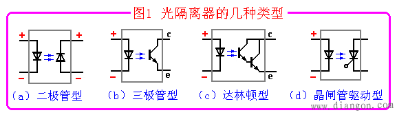 把发光器件和光敏器件按适当方式组合,就可以实现以光信号为媒介的电信号变换。采用这种组合方式制成的器件称为光电耦合器。光电耦合器一般制成管式或双列直插式结构,由于发光器件和光敏器被相互绝缘地分置于输入和输出回路,故可实现两路间的电气隔离。光电耦合器既可用来传递模拟信号,也可作为开关器件使用,也就是它具有变压器和继电器的功能。但光电耦合器的体积小、重量轻、寿命长、开关速度比继电器快,且无触点、耗能少。与变压器相比,工作频率范围宽,耦合电容小,输入输出之间绝缘电阻高,并能实现信号的单方向传递。