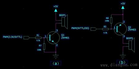 图一的a 电路用的是NPN管,注意蜂鸣器接在三极管的集电极,驱动信号可以是常见的3.3V或者5VTTL,高电平开通,电阻按照经验法可以取4.7K. 例如a电路,开通时假设为高电平5V,基极电流Ib=(5V-0.7V)/4.7K=0.9mA,可以使三极管完全饱和。b 电路用的是PNP管,同样把 蜂鸣器接在三极管的集电极,不同的是驱动信号是5V的TTL电平。以上这两个都可以正常工作,只要PWM驱动信号工作在合适的频率,蜂鸣器(有源)都会发 出最大的声音。