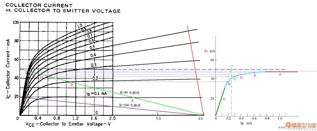 图中假定电源电压为4V,绿色的斜线是负载电阻为80欧姆的负载线,V/R=50MA,图中标出了Ib分别等于0.1、0.2、0.3、0.4、0.6、1.0mA的工作点A、B、C、D、E、F.据此在右侧作出了Ic与Ib的关系曲线。根据这个曲线,就比较清楚地看出“饱和”的含义了。曲线的绿色段是线性放大区,Ic随Ib的增大几乎成线性地快速上升,可以看出β值约为200。兰色段开始变弯曲,斜率逐渐变小。红色段就几乎变成水平了,这就是“饱和”.实际上,饱和是一个渐变的过程,兰色段也可以认为是初始进入饱和的区段。在实际工作中,常用Ib*β=V/R作为判断临界饱和的条件。在图中就是假想绿色段继续向上延伸,与Ic=50MA的水平线相交,交点对应的Ib值就是临界饱和的Ib值。图中可见该值约为0.25mA。