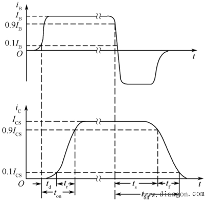 存储时间ts:把基极电流从正向IB1变为反向IB2时,iC下降到0.9ICS所需的时间。