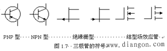 晶体管可分为两大类:一类是结型晶体管,由两个PN结组成,有PNP及NPN两种结构。这类晶体管工作时,半导体中的电子和空穴两种载流子同时参与导电,所以又叫双极型晶体管。另一类是场效应晶体管,有结栅场效应晶体管、金属-氧化物-半导体(MOS)场效应晶体管及肖特基势垒场效应晶体管等结构。这类晶体管工作时,只有半导体中的多数载流子起主要作用,所以又叫单极型晶体管。三极管的符号如图所示。