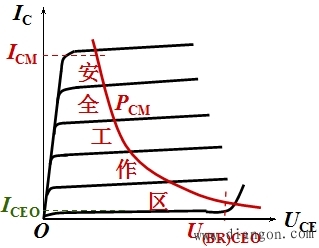 由ICM、U(BR)CEO、PCM三者共同确定晶体管的安全工作区。