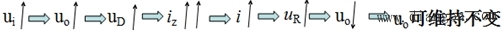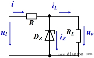 | 稳压二极管工作原理:ui保障其处于反向击穿状态;R:限流电阻,保证DZ中电流不超过最大稳定电流 IZM;RL:负载电阻 |