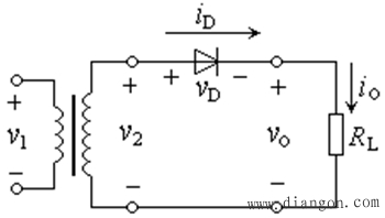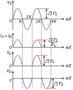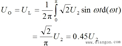 (b)波形图 根据图可知,输出电压在一个工频周期内,只是正半周导电,在负载上得到的是半个正弦波。负载上输出平均电压为 |