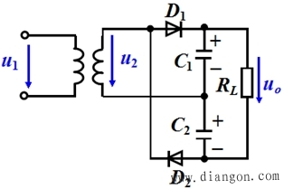 可选:1000F,耐压 50 V 的电解电容。 倍压整流电路 二倍压整流电路 u2的正半周时:D1导通,D2截止,理想情况下,电容C1的电压充到: u2的负半周时:D2导通,D1截止,理想情况下,电容C2的电压充到: |