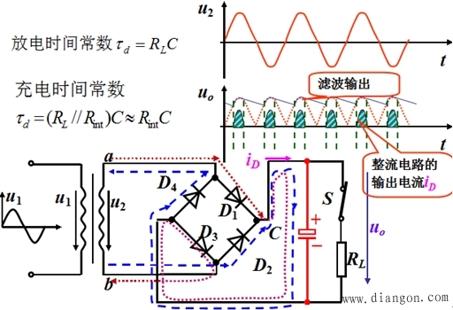 u2负半周时: D2、D4 导通, D1 、D3截止 (3)主要参数: 输出电压平均值:Uo=0.9u2 输出电流平均值:Io=Uo/Ro=0.9u2 / RL 流过二极管的平均电流:ID=Io/2 二极管承受的最大反向电压: |