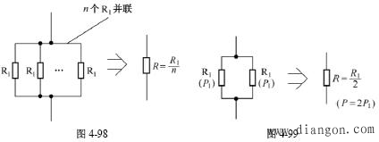 (1)电阻并联增大功率。图4-99所示为两个相同阻值、相同功率的电阻R1并联,其等效电阻的总阻值