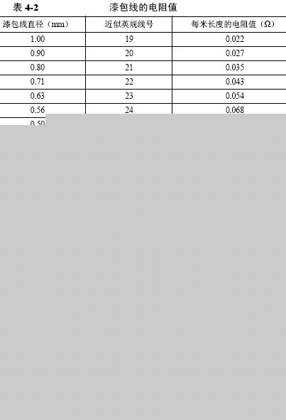 (2)对于数欧姆以下的特小阻值电阻,也可采用细漆包线对折后绕制,方法同上。表4-2所示为几种细漆包线每米长度的电阻值,可供自制电阻器时参考。例如直径0.1mm的漆包线,10cm长度的线段电阻值约为0.224Ω。